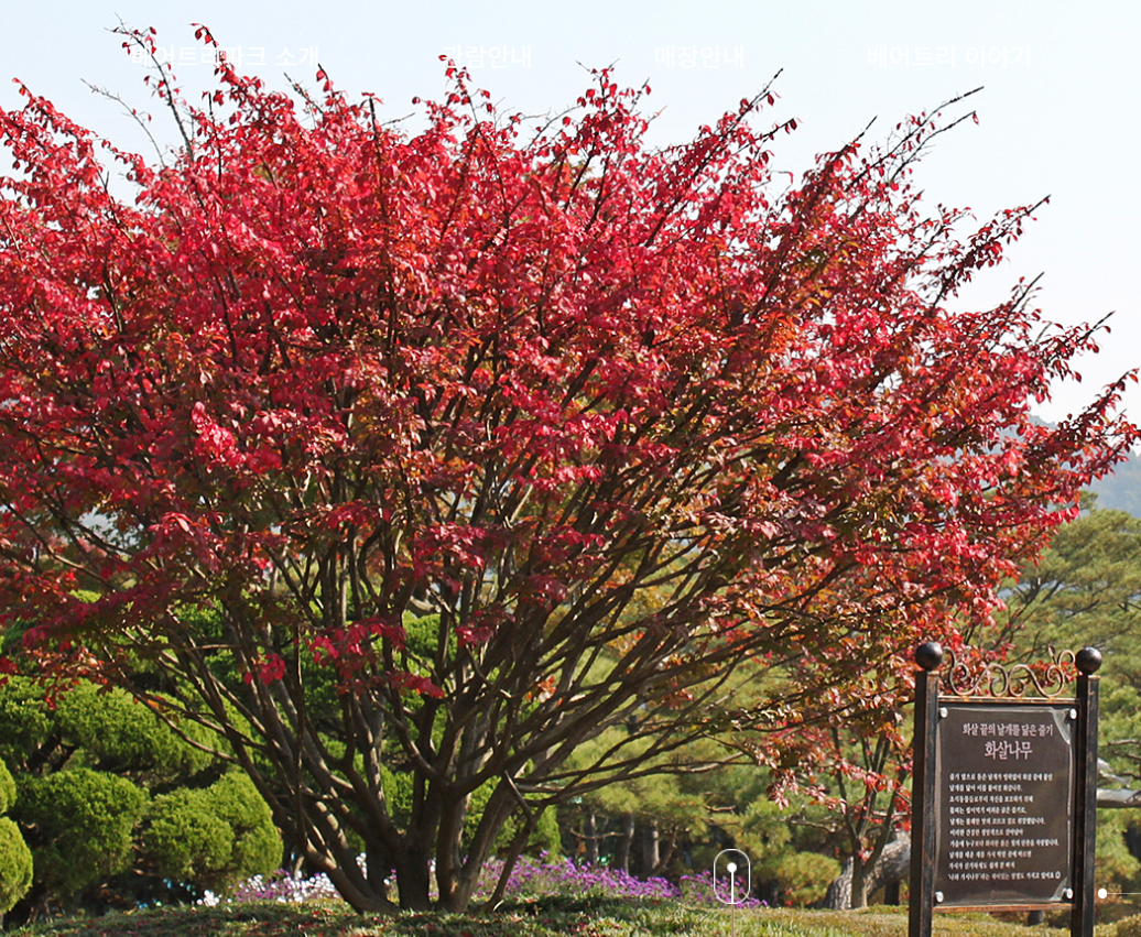 베어트리파크는 10만여 평의 대지 위에 동물원과 수목원이 어우러진 독특한 공간입니다. 2만 그루의 단풍나무가 만들어내는 황홀한 가을 풍경 속에서 1000여 종의 꽃과 나무, 그리고 다양한 동물들을 만나볼 수 있어요.