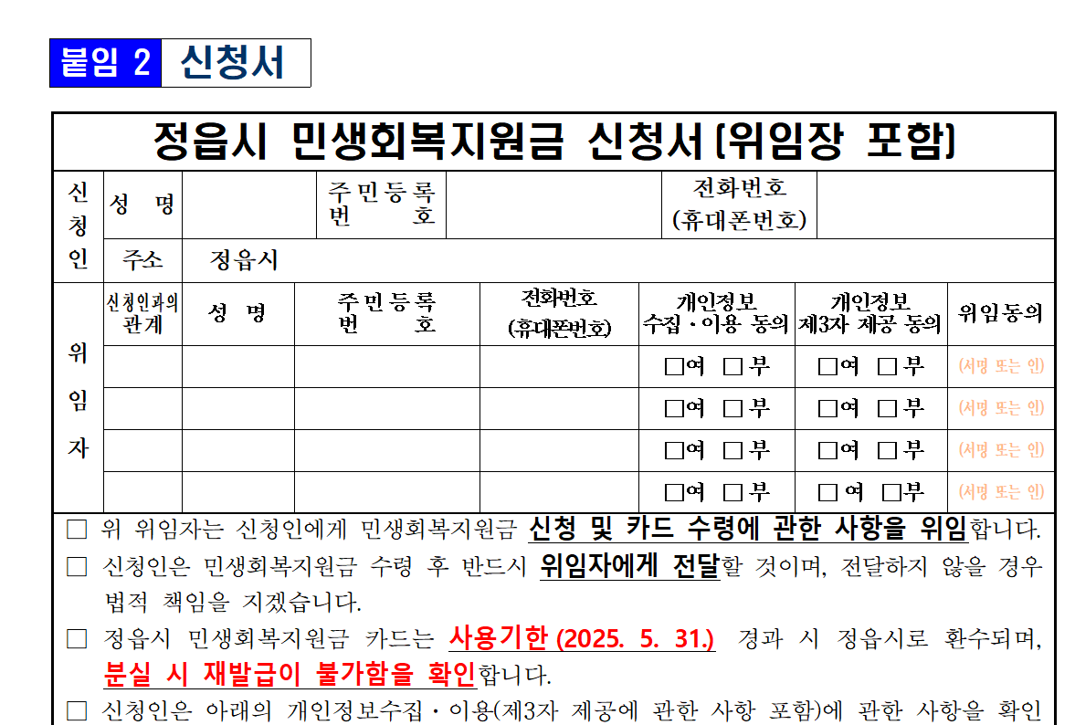 - 신청서: 대리 신청자와 위임자가 함께 서명해야 합니다.