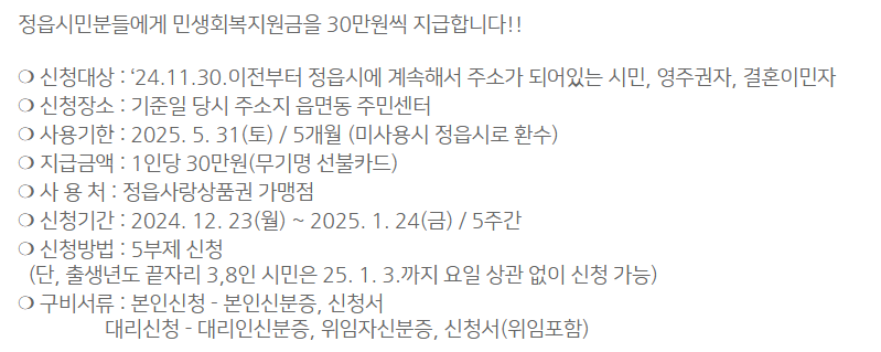 📌 정읍시 민생회복지원금은 경제적 부담을 덜고 지역 사회와 상생할 수 있는 좋은 기회입니다. 신청 기간을 놓치지 말고 준비된 서류와 함께 주민센터를 방문해 신청하세요! 정읍시청 공식 홈페이지에서 추가 정보를 확인할 수 있습니다.