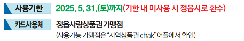 - 무기명 선불카드 형태로 지급되며, 정읍사랑상품권 가맹점에서만 사용 가능합니다.
